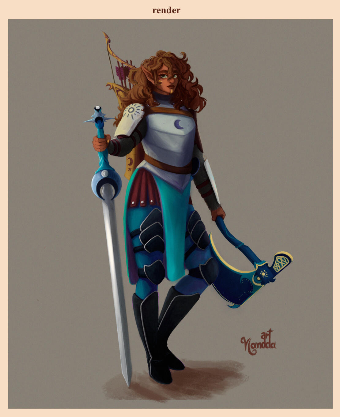 Armor (full body) + weapon concept art (character drawn with armor and weapon - this doesn't include character concept art):